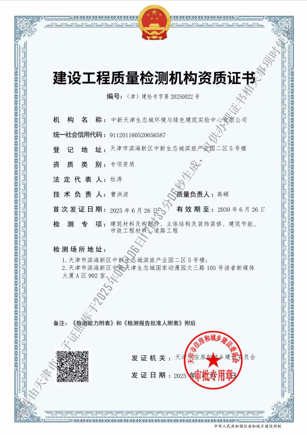 公司發(fā)展至今,技術能力不斷拓展和提升。現已具備檢驗檢測機構資質(簡稱CMA)、天津市建設工程質量檢測機構資質、中國合格評定國家認可委員會實驗室認可資質(簡稱CNAS)等資質。同時,公司已被認定為高新技術企業(yè)、天津市專精特新中小企業(yè)、濱海新區(qū)首家近零能耗建筑第三方測評機構。公司主要從事建筑材料及構配件、主體結構及裝飾裝修、建筑節(jié)能、道路工程等檢驗檢測服務,以及綠色建筑節(jié)能評估、近零能耗、房屋質量安全鑒定等咨詢服務業(yè)務。公司在冊員工為60人,其中高級職稱30名,中級職稱20名,初級職稱10名。